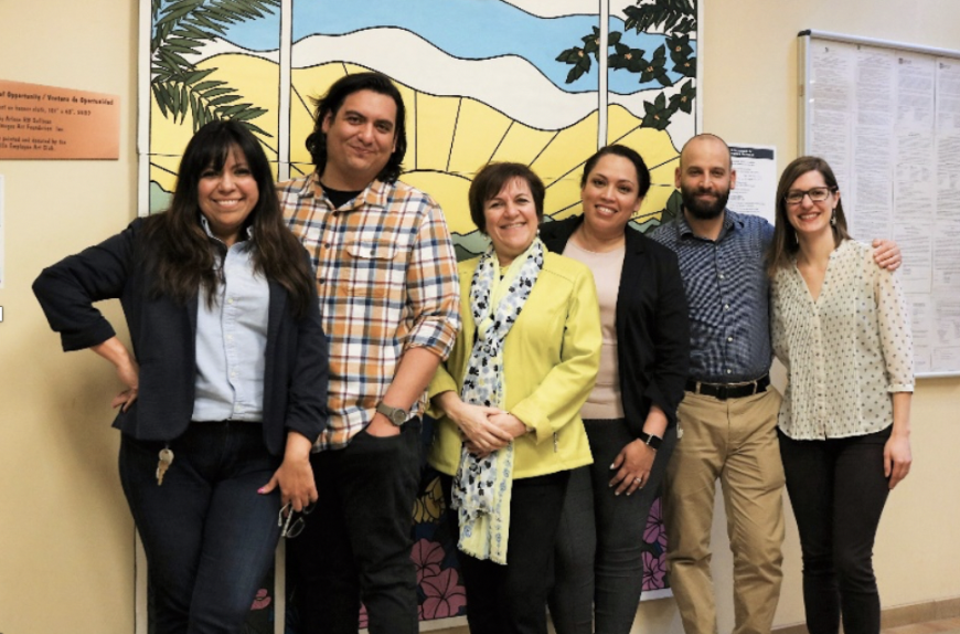 Photo caption: Left to right: Liliana Letran-Garcia, Associate Director of Economic Empowerment, Ricardo Perez, Community Engagement Manager, Ruby Lee, President and CEO, Angelica Klebsch, Senior Director of Policy and Community Development, Aaron Johnson-Ortiz, Latino Arts and Cultural Engagement Liaison; Brittany Kellerman, Director of Strategy and Innovation.