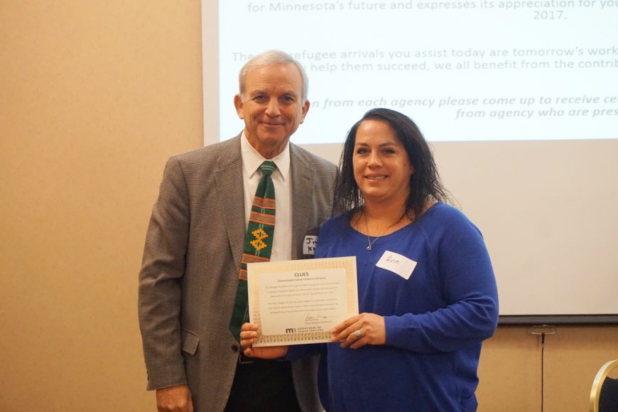 CLUES was honored to receive a Certificate of Appreciation for the contributions our Refugee Employment Services program has made to the refugee populations in Minnesota. The award was presented by Jim Koppel, Assistant Commissioner of the Minnesota Department of Human Services at the annual Resettlement Programs kick-off event.