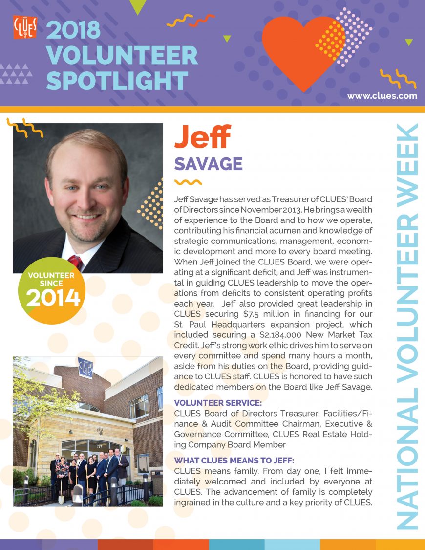 Today’s National Volunteer Week spotlight honors Jeff Savage, who has served as Treasurer of CLUES’ Board of Directors since November 2013.