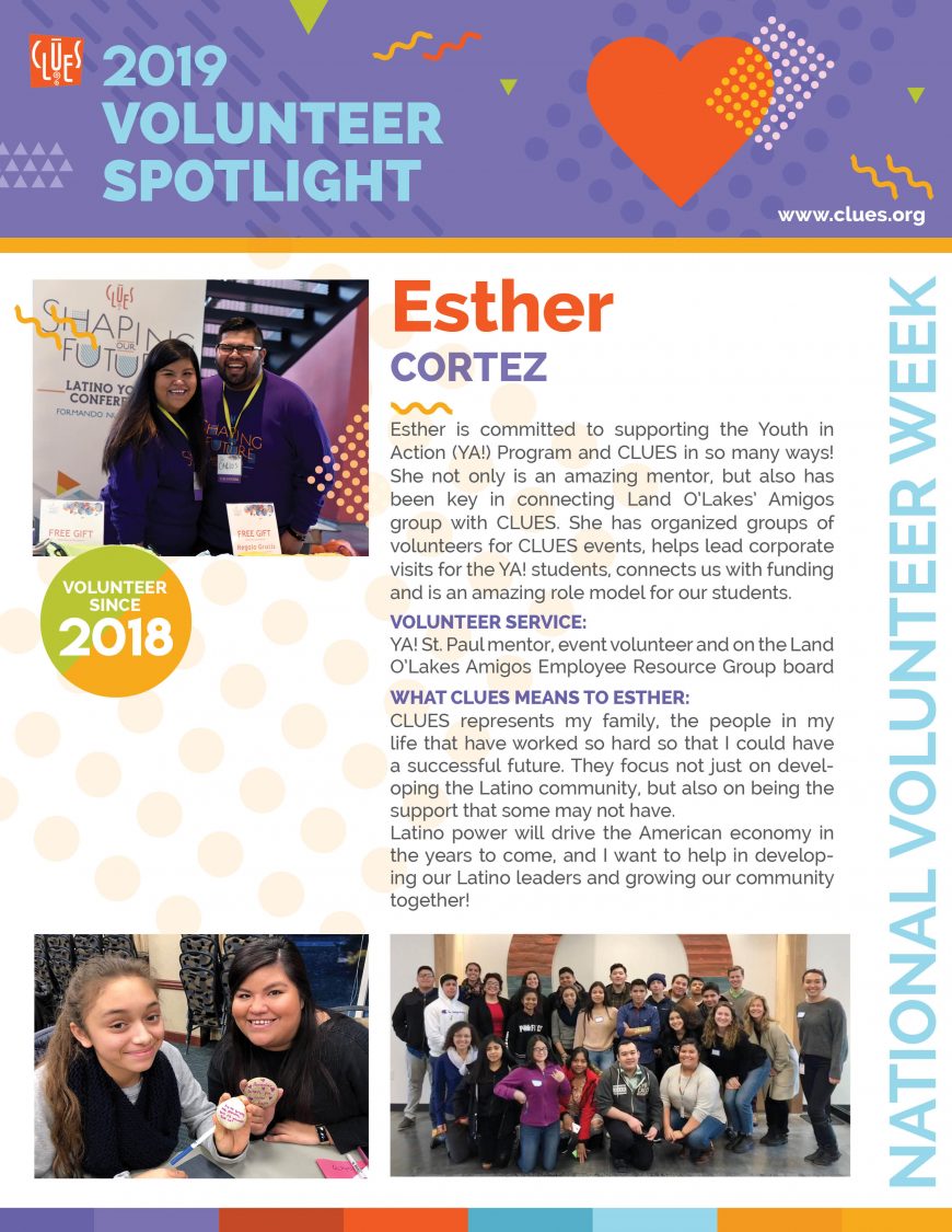 Today’s volunteer in the spotlight is Esther Cortez! Esther is committed to supporting the Youth in Action (YA!) Program and CLUES in so many ways! She not only is an amazing mentor but also has been key in connecting Land O’Lakes’ Amigos group with CLUES. In addition to that, she organizes groups of volunteers for CLUES events, helps lead corporate visits for the YA! students connect us with funding and is an amazing role model for our students.